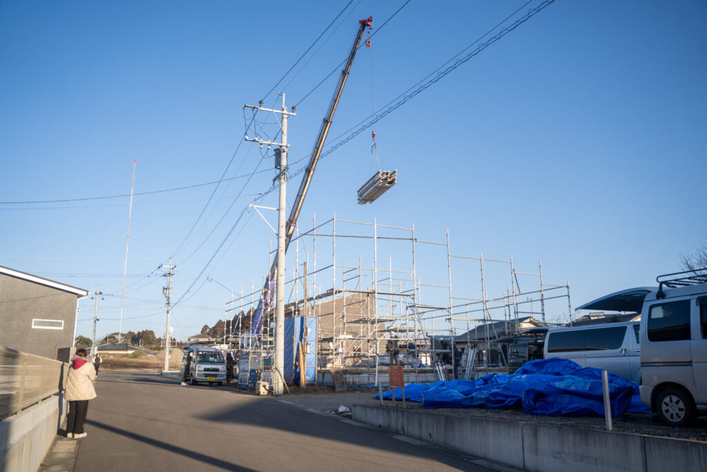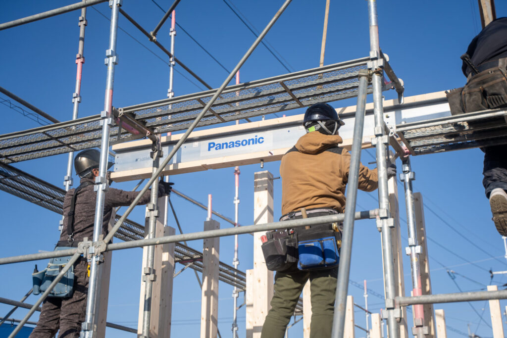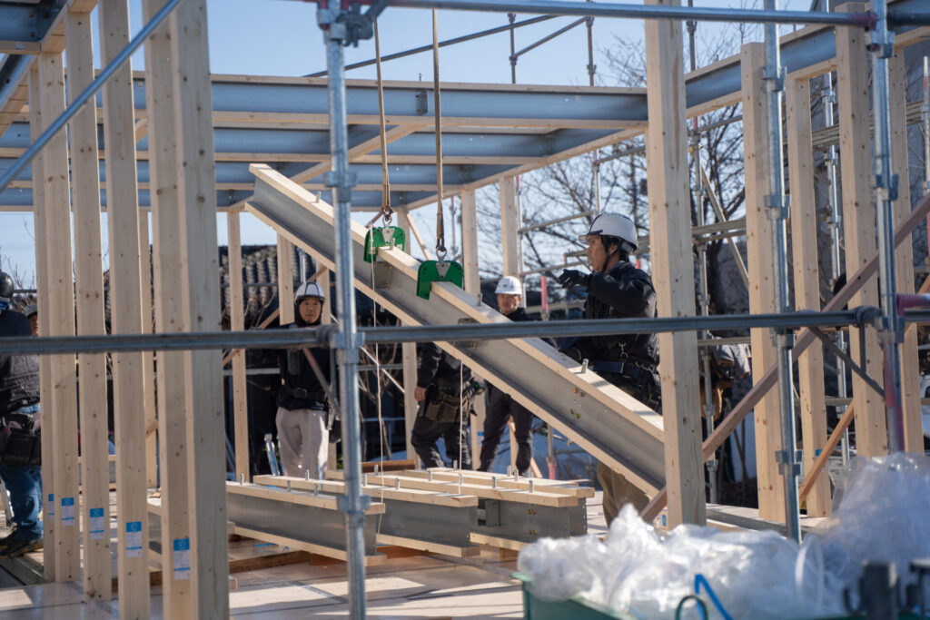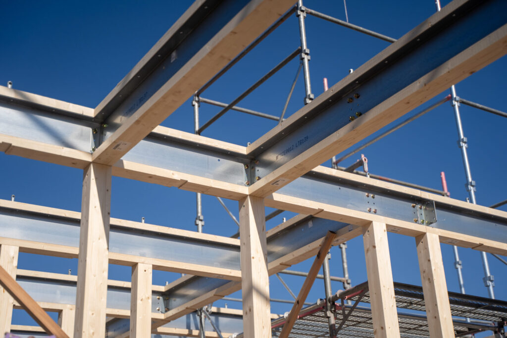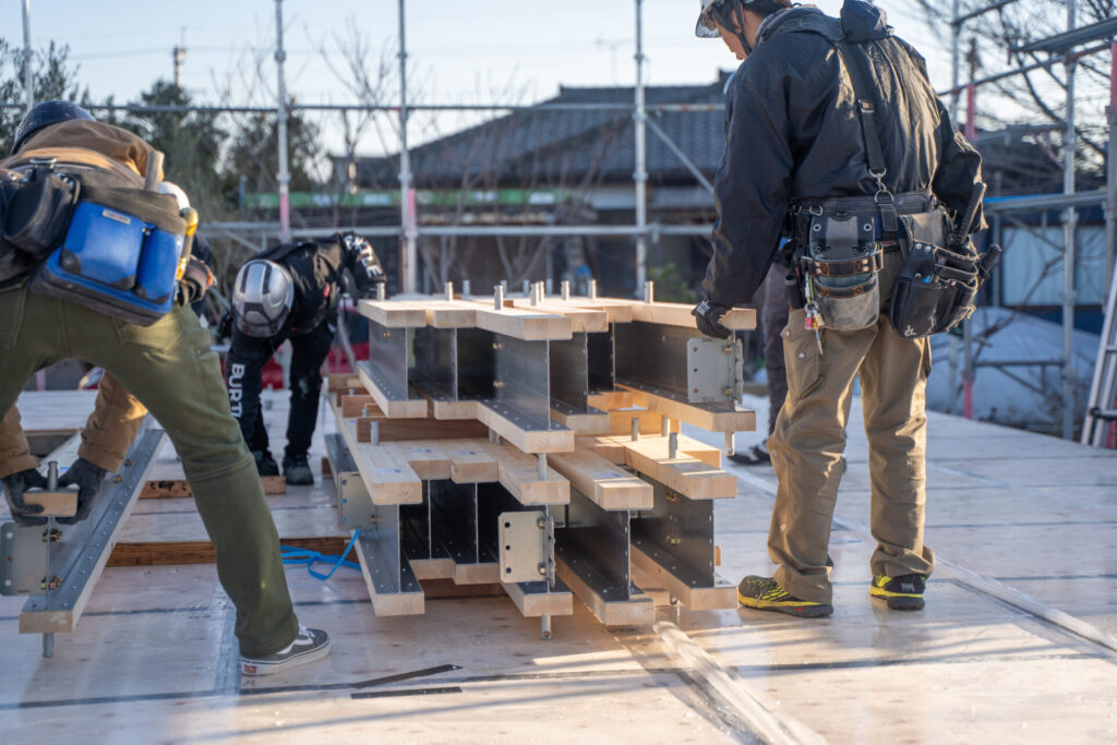 テクノストラクチャーの大きな特長である「テクノビーム」木の梁に鉄を組み合わせ強度を高めた独自部材です。上棟の際にしか見られない「テクノビーム」